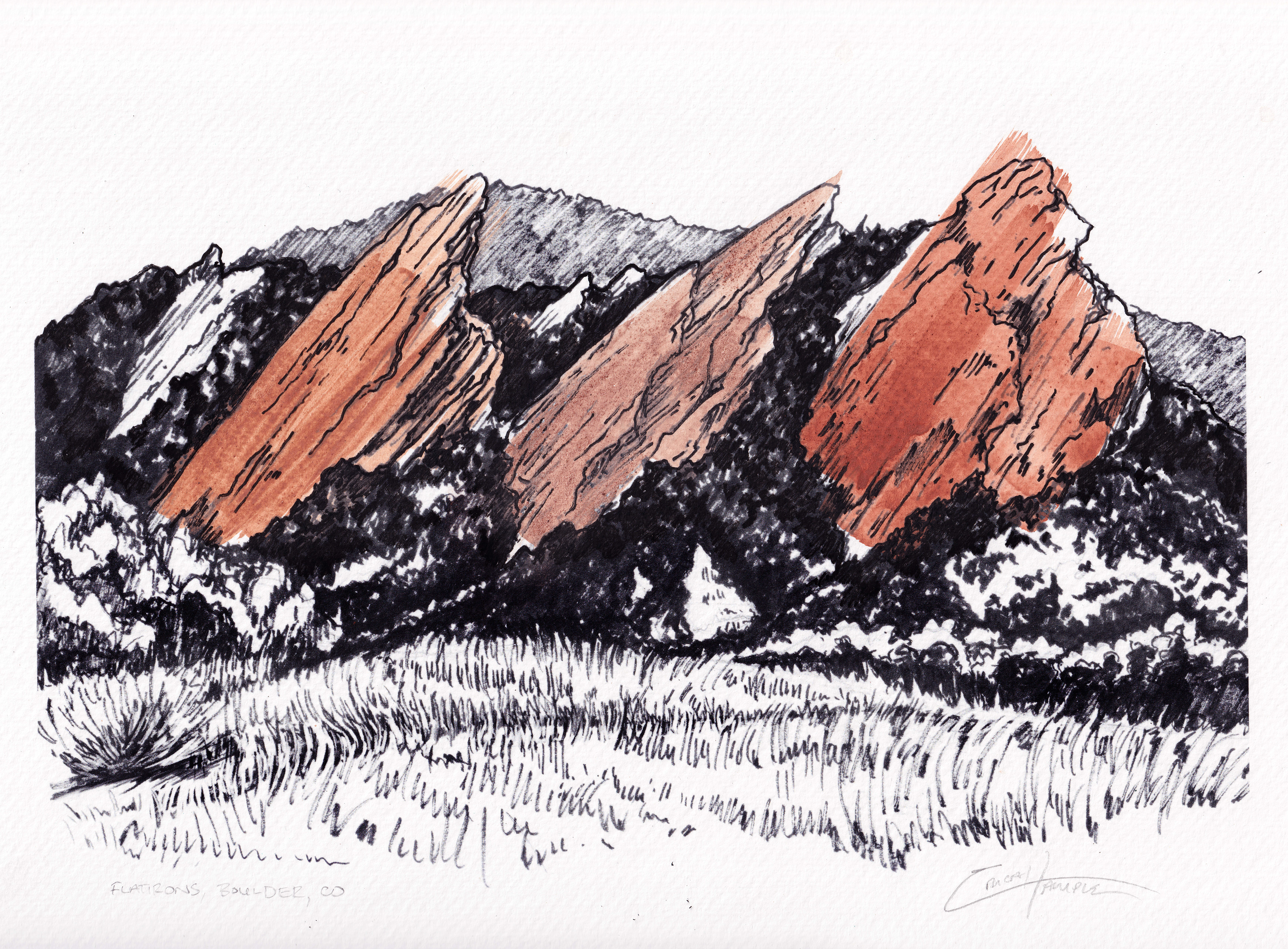 This print is accented by pigments ground from 3 different outcroppings of the Fountain Formation-one for each flatiron.